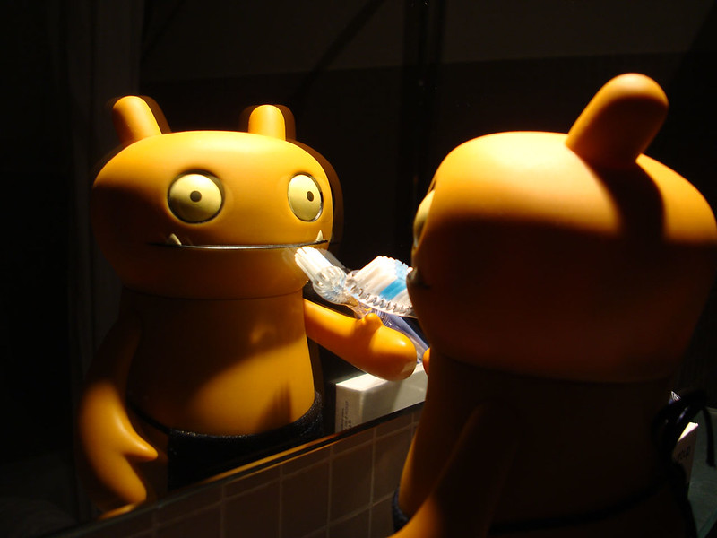 He decided to shower and brush his teeth in the dark so as not to wake me up. While brushing his teeth he realised the mirror in the bathroom gave a weird kind of double image when you looked at it from an angle and set the camera up to take a picture of him brushing his teeth in front of it.