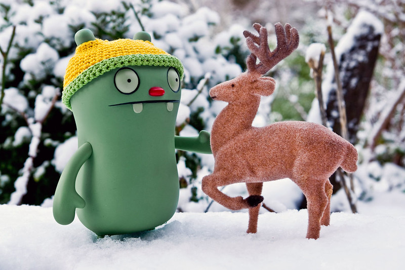"What woulds Babo tells me to do, hmmm", he pondered for a minute or two and then all of a sudden he had his first ever brainwave, "I must makes very very slows movement, so I doesn't scares the reindeer aways, if I don't threatens of scares it maybe it lets me says hello".