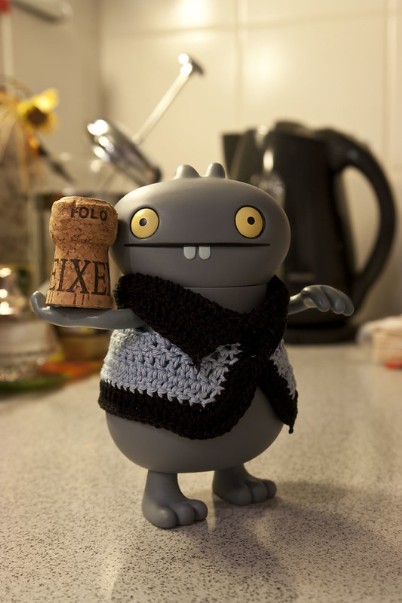 Tonights I gets to learn somethings new evens for me, as it was the firsts time that Baz was visitings the parenters from Mireille they hads some bottles of what they calleds "Bubblies", and this thing that you can sees me holdings was keepings it all insides of the bottles.